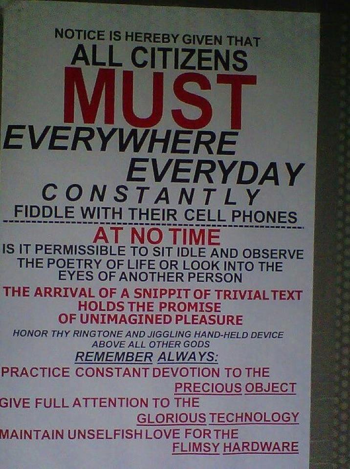 "official" notice requiring all citizens to "constantly fiddle with their cell phones", "give full attention to the glorious technology" and "maintain unselfish love for the flimsy hardware"